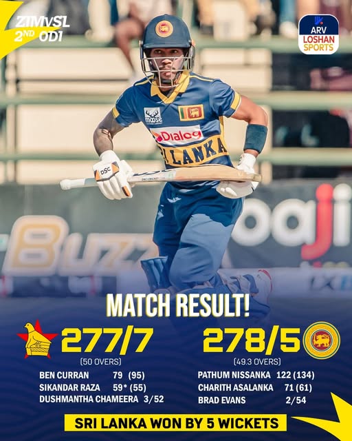 பாத்தும் நிஸ்ஸங்கவின் சதம், சரித் அசலங்காவின் அரைசதம், ஜனித் லியனகேவின் இறுதி ஆட்டம் – இலங்கை அணி இரண்டாவது ஒருநாள் போட்டியில் 5 விக்கெட் வித்தியாசத்தில் வெற்றி இலங்கை அணி, மூன்று ஒருநாள் போட்டிகள்…
